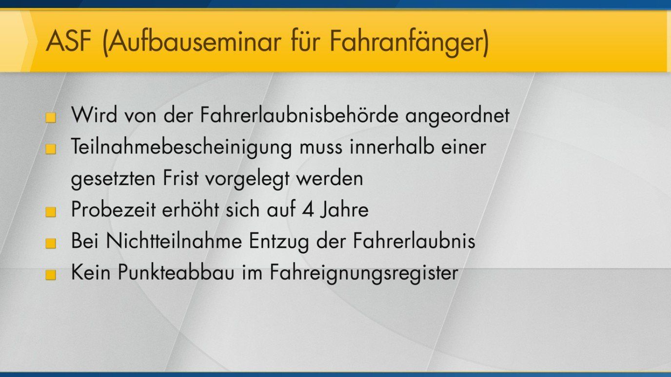 "ASF" ist damit ein Seminar, das dazu dient, Fahranfängern die Fahrerlaubnis zu erhalten.